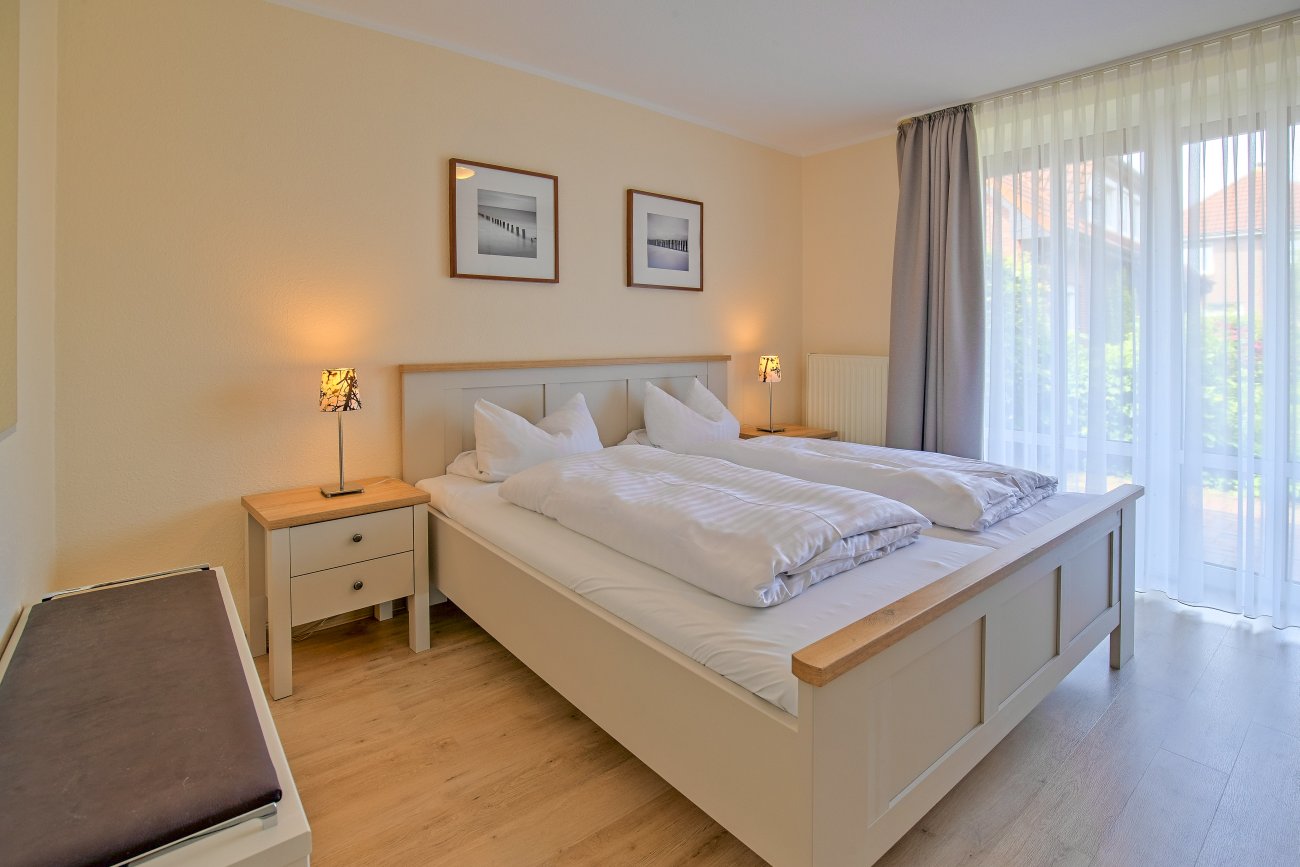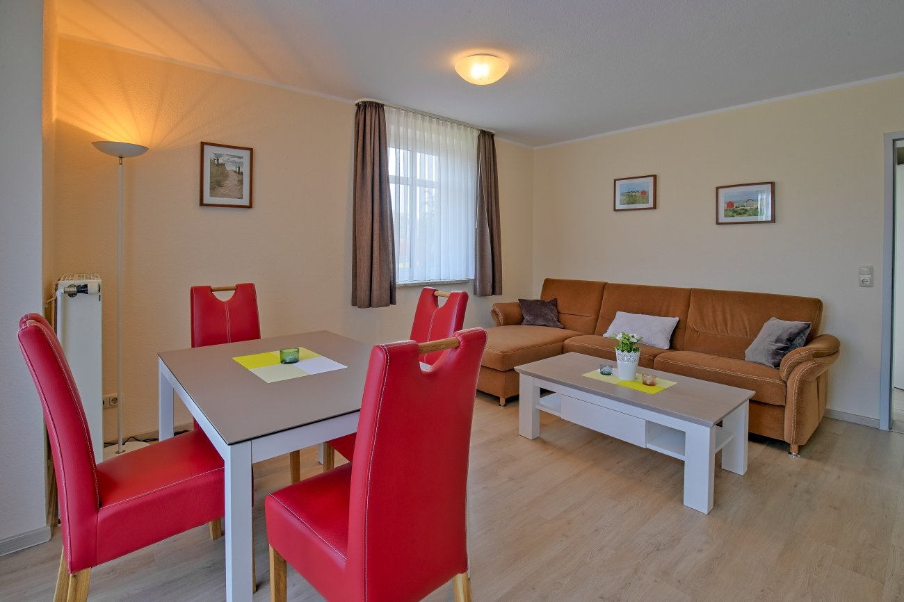 Wohnung „Strandhafer“ Erdgeschoss, ca. 48 m², 2 – 3 Personen, 2 Zimmer, Küche, Dusche, WC, Abstellraum, Terrasse